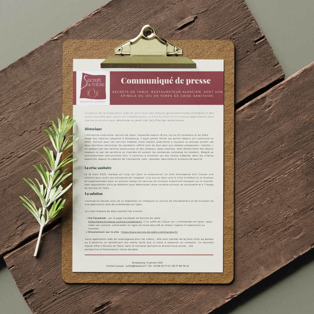 Afin de communiquer en toute autonomie, Secrets de Table, restaurateur alsacien, a fait appel aux services de l’agence Idealice pour développer sa stratégie sur les réseaux sociaux et ses outils de communication. Ainsi, nous proposons un service d’accompagnement permettant la prise en main de ces outils, et avons également mis en place une stratégie de communication que Secrets de Table met en oeuvre.
